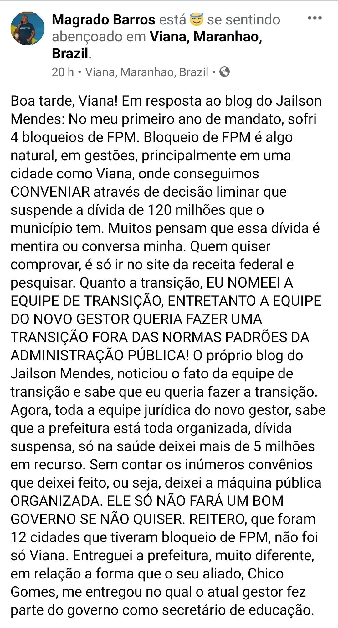 Magrado Barros, agora ex prefeito, posta em rede social que deixou Viana um brinco, banhada a ouro, com milhões em conta, alega não ter pago servidores por falta de recurso e disse que deixou tudo para Carrinho pagar.