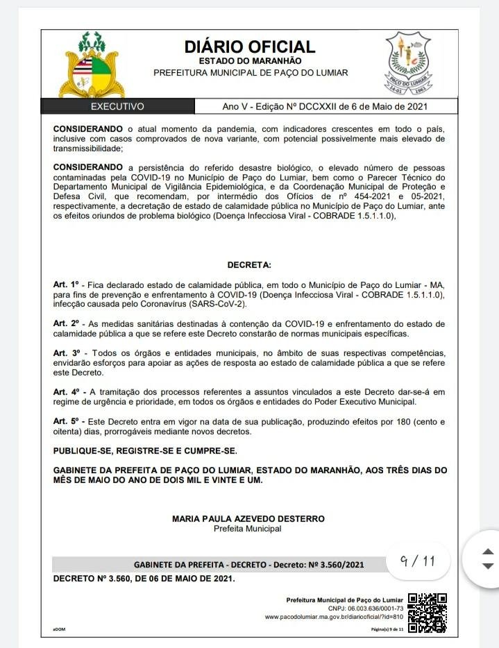 O Tribunal de Contas do Estado e a Promotoria de Justiça precisam apurar urgentemente mais uma vez esse decreto diante a falta de transparência no gasto de recursos públicos e também na divulgação dos casos registrados de Covid 19 no município, pois se há uma queda nos casos registrados em todo o Maranhão, não há motivos para mais um estado de calamidade. Em tempo a titular da Promotoria de Justiça de Paço do Lumiar, Gabriela Tarvernard abriu 11 (onze) inquéritos de uma só vez para investigar diversas irregularidades no governo Pindoba, que já começou de mal a pior. Vamos aguardar…
