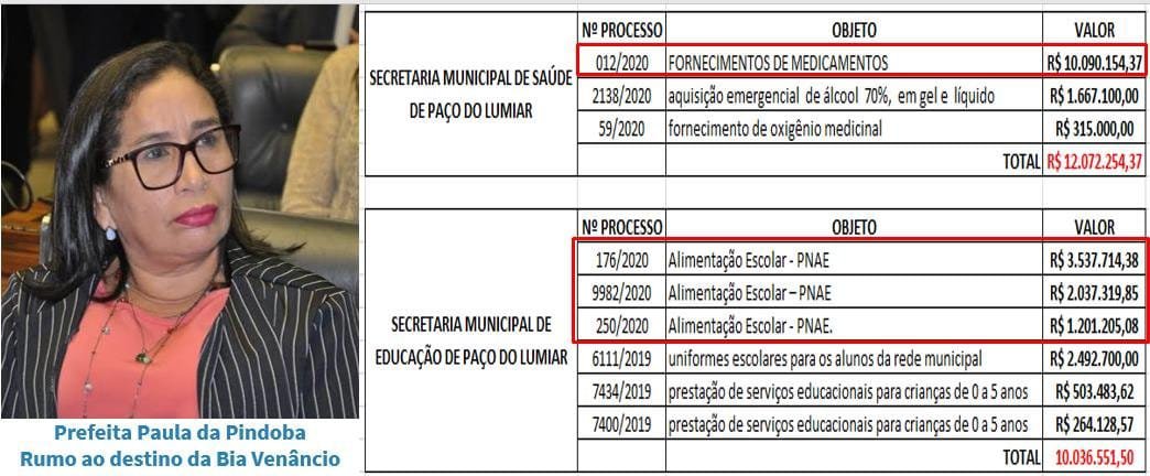 A Prefeitura de Paço do Lumiar por meio da Secretaria Municipal de Saúde comprou 270.850 mil litros de álcool em gel por R$ 1,667.100,00 milhões sem licitação e ainda R$ 10.090.154,00 milhões em medicamentos e R$ 315.000,00 em oxigênio no ano de 2020. Praticamente um absurdo, pois se qualquer cidadão luminense caminhar nas Unidades Básicas de Saúde, as que não estarão fechadas, talvez não encontre um algodão para fazer um simples curativo.