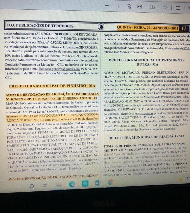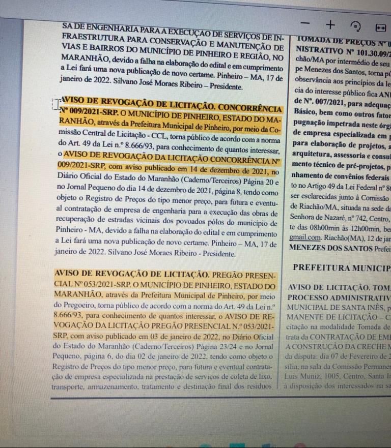 A prefeita em exercício de Pinheiro, Ana Paula Lobato (PDT), revogou três licitações que seriam feitas nos próximos dias pela prefeitura. A medida foi publicada no diário oficial na quinta-feira (20), poucos dias após assumir o comando do Executivo, em razão do afastamento de Luciano Genésio (PP) do cargo por ordem do TRF (Tribunal Regional Federal) da 1ª Região.