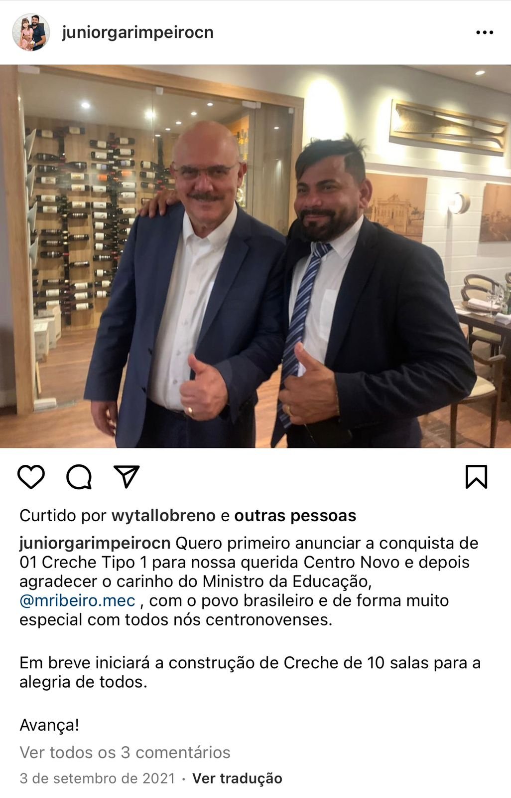 O prefeito Júnior Garimpeiro esteve em Brasília em 27 de março de 2021, em seguida o próprio Ministro da Educação esteve no dia 15 de maio em uma visita um tanto quanto inusitada em Centro Novo, posteriormente em setembro, em nova visita à capital do país, o prefeito Júnior Garimpeiro anunciou a aquisição de uma creche do tipo um para cidade, com recursos oriundos do governo federal que até hoje a obra nunca fora iniciada.