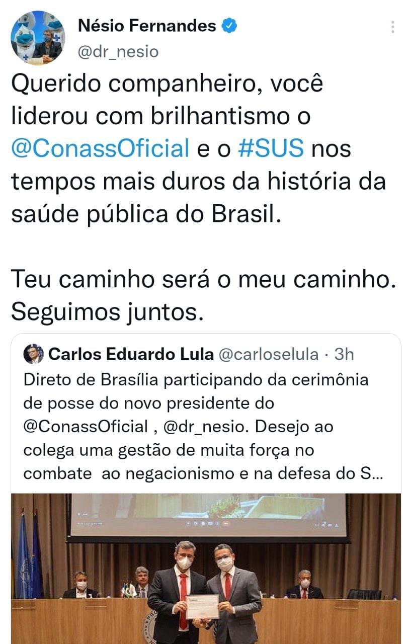 Na noite de ontem, 27, Carlos Lula participou da posse do novo presidente do Conass, Dr Nesio Fernandes. Pelo Twitter, Lula desejou ao colega uma gestão de muita força no combate ao negacionismo e na defesa do SUS que dá certo.