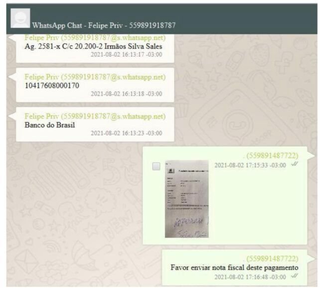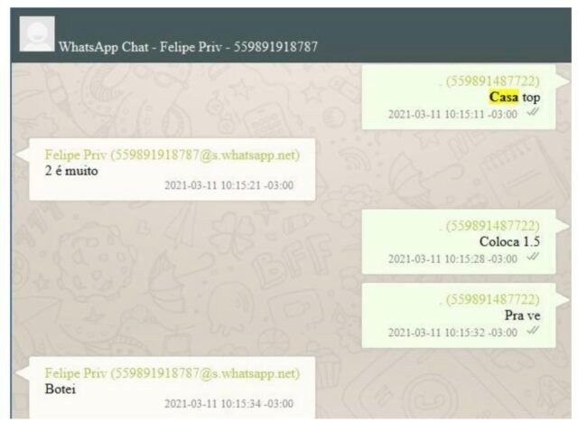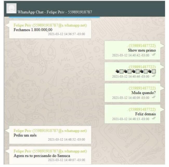 Na conversa, Felipe fala sobre uma pessoa chamada de “Samuca”. A PF verificou que trata-se Samuel Martins Costa Filho. Segundo os federais, Sarmeul é “responsável por intermediar contratações fraudulentas entre empresas e a prefeitura Municipal de Santa Inês – MA com o consequente pagamento de propina”.