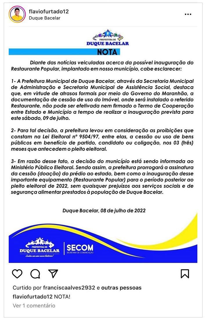 Em uma nota publicada no seu perfil no Instragram na última sexta-feira (08) – com apenas duas curtidas e um comentário, o gestor bacelarense “cria pelos em ovos” ao justificar o motivo pelo qual não quer o Restaurante Popular em sua cidade.