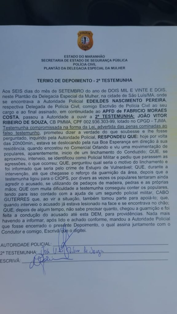 Neste momento, o policial militar visualizou uma situação de linchamento do acusado. O mesmo foi até a local com intuito de salvaguardar a vida do suspeito e obter mais informações sobre o ocorrido, e foi nformado que o mesmo era morador de rua e teria cometido estupro a vuneral de uma criança.
