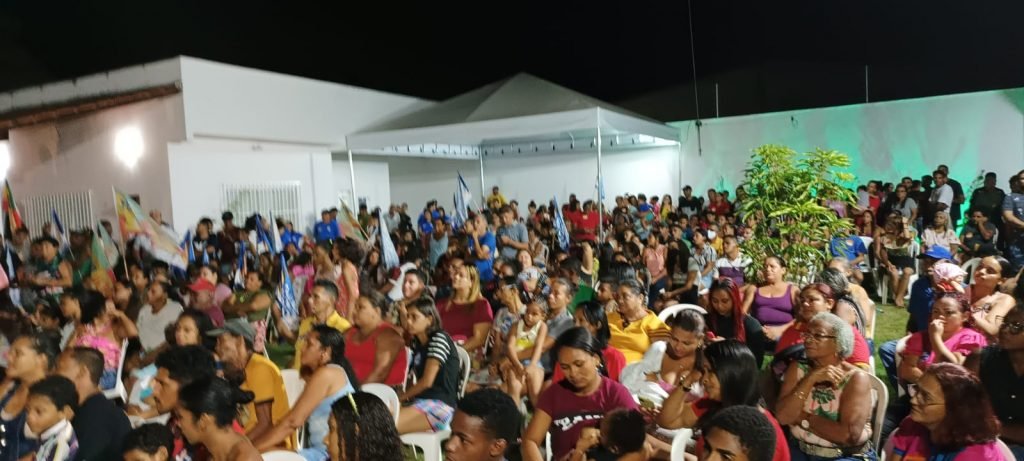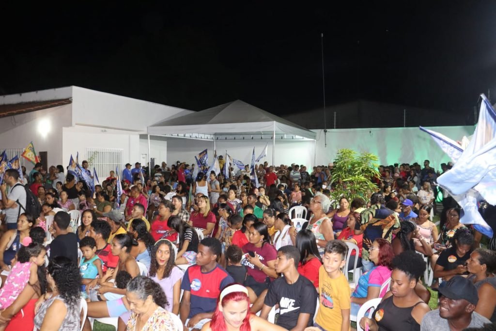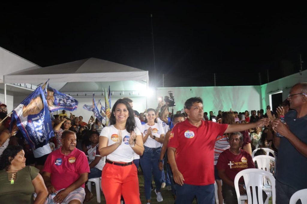 Vereadora Bianca apresenta seus candidatos Márcio Jerry e Glalbert Cutrim a uma multidão na Vila São José