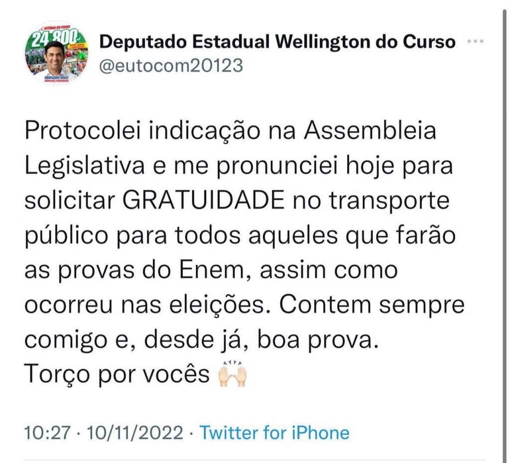 “Protocolei indicação na Assembleia Legislativa e me pronunciei hoje para solicitar gratuidade no transporte público para todos aqueles que farão as provas do Enem, assim como ocorreu nas eleições. Infelizmente, a pobreza ainda é realidade na vida de milhares de pessoas. Muitos não tem sequer como pagar uma passagem. Por isso, para evitar mais essa barreira, apresentei a indicação. A educação muda vidas e é nosso papel facilitar que todos tenham oportunidades. Contem sempre comigo e, desde já, boa prova”, disse o deputado Wellington do Curso.