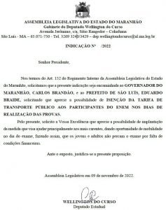 Nesta quinta-feira (10), o deputado estadual Wellington do Curso destacou indicação de sua autoria em que solicita ao Governo do Estado e à Prefeitura de São Luís a gratuidade no transporte público para todos os maranhenses que irão fazer a prova do Exame Nacional do Ensino Médio (Enem). A indicação foi protocolada no sistema da Assembleia e encaminhada a Carlos Brandão, governador do estado, e Eduardo Braide, prefeito de São Luís.