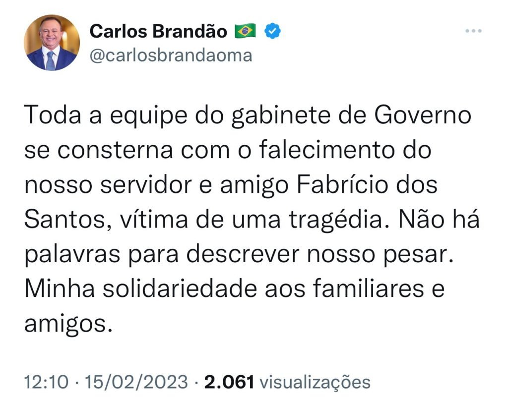 Em postagem pela rede social, o governador do estado, Carlos Brandão lamentou a morte do servidor: