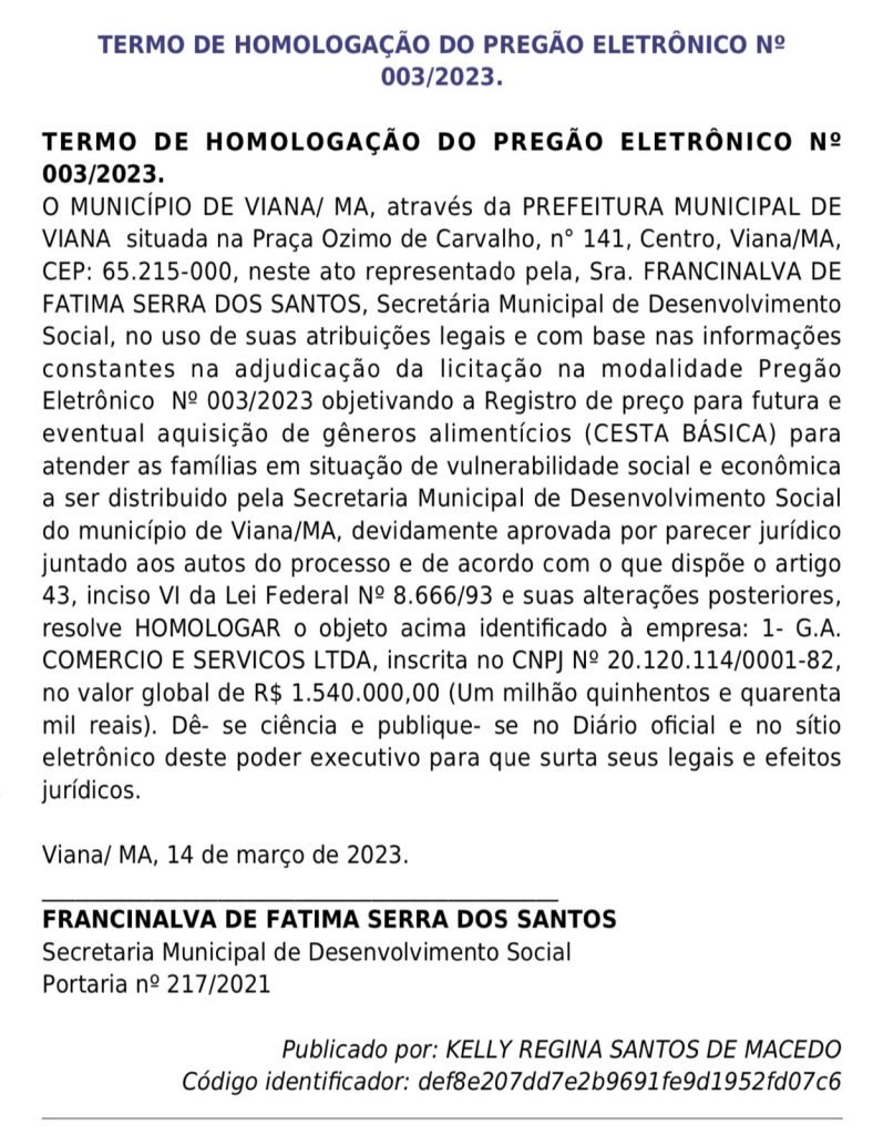 Absurdo! Prefeitura de Viana licita cesta básica com empresa de material de construção