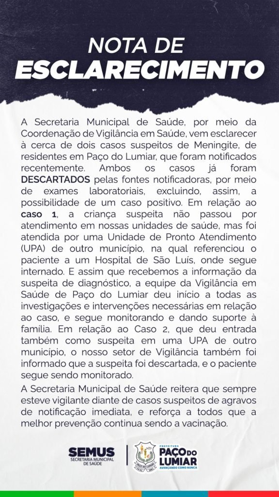 Saúde, vem esclarecer acerca de dois casos suspeitos de meningite de pessoas residentes em Paço do Lumiar, que foram notificados recentemente.
