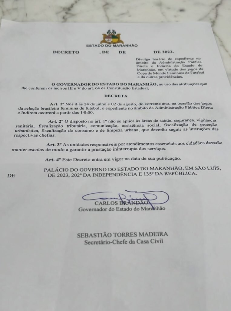 Informo que, nos próximos dias 24 de julho e 2 de agosto, por ocasião dos jogos da seleção brasileira feminina de futebol na Copa do Mundo, o expediente da administração pública do estado do Maranhão ocorrerá a partir das 14h, exceto para serviços essenciais.