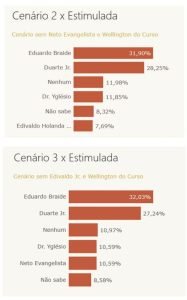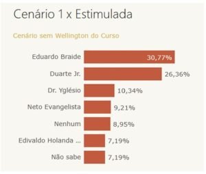 De acordo com o levantamento, conduzido entre os dias 16 e 20 de outubro, com a participação de 796 eleitores, o atual prefeito Eduardo Braide (PSD) continua liderando no cenário estimulado, com 29,76% das intenções de votos. No entanto, ele agora está sendo acompanhado de perto pelo deputado federal Duarte Júnior (PSB), que alcançou 25,22% da preferência.