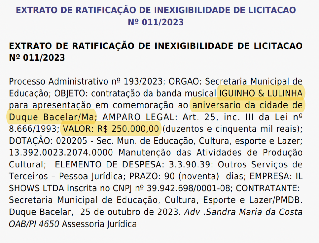 FARRA DOS SHOWS: Prefeitura de Duque Bacelar/MA vai pagar R$ 250 mil no show de Iguinho e Lulinha