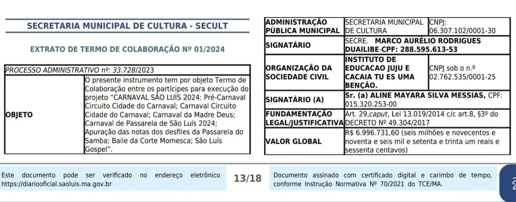 Pelo extrato do Termo de Colaboração, publicado na edição do dia 26 de janeiro no Diário Oficial do Município, o contrato se dá para execução do projeto “Carnaval de São Luís 2024″, com as seguintes definições: ‘Pré-Carnaval Circuito Cidade do Carnaval; Carnaval Circuito Cidade do Carnaval; Carnaval da Madre Deus; Carnaval de Passarela de São Luís 2024; Apuração das notas dos desfiles da Passarela do Samba; Baile da Corte Momesca; e São Luís Gospel”.