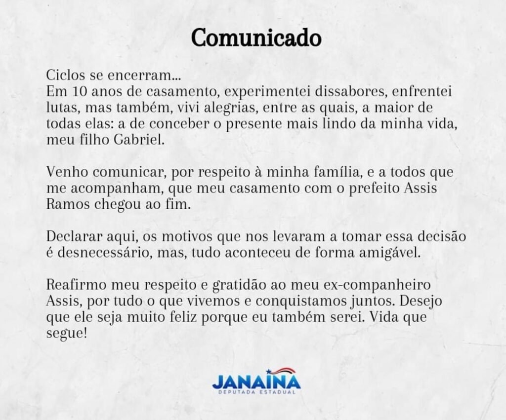 Em um comunicado inesperado, a deputada estadual Janaína anunciou sua separação do prefeito de Imperatriz, Assis Ramos. O pronunciamento foi feito por meio das redes sociais, surpreendendo a população e a classe política local.