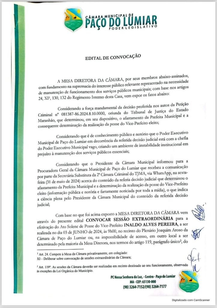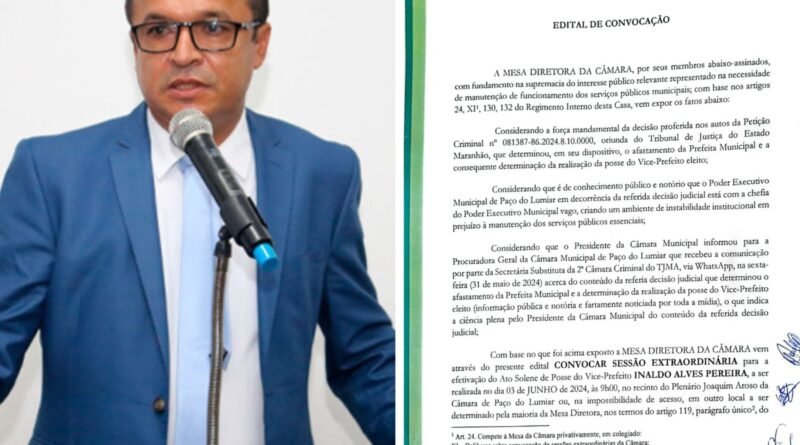A Mesa Diretora da Câmara Municipal de Paço do Lumiar convocou urgentemente os vereadores e o vice-prefeito Inaldo Pereira para a cerimônia de posse, marcada para esta segunda-feira, 3 de junho. A ação foi motivada pelo afastamento da prefeita Paula da Pindoba, envolvida em suspeitas de participação em um esquema de corrupção.
