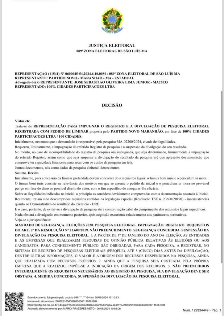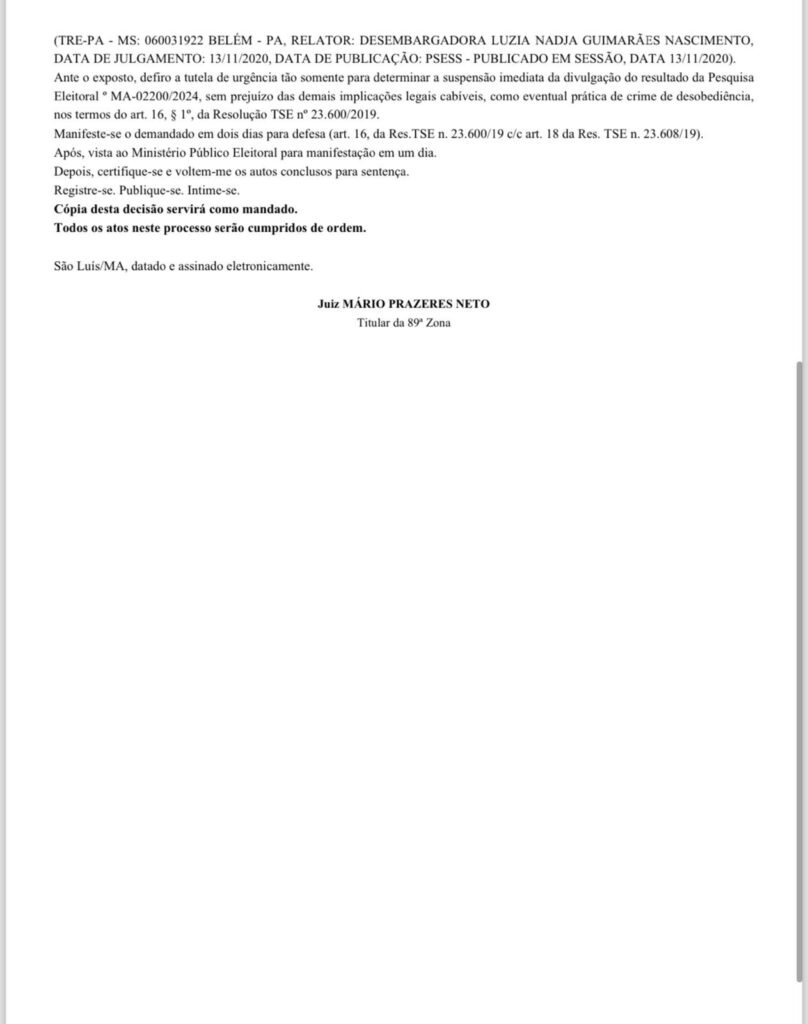 No bojo da decisão, o juiz Mario Prazeres Neto, titular da 89ª Zona Eleitoral, afirma que “Realmente, teriam sido descumpridos requisitos contidos na legislação especial (Resolução TSE n. 23600/20190) – inconsistências quanto ao Demonstrativo do resultado do exercício – DRE. É o caso, portanto, de evitar-se a divulgação da pesquisa até a comprovação cabal do cumprimento dos requisitos legais específicos”, disse o magistrado.