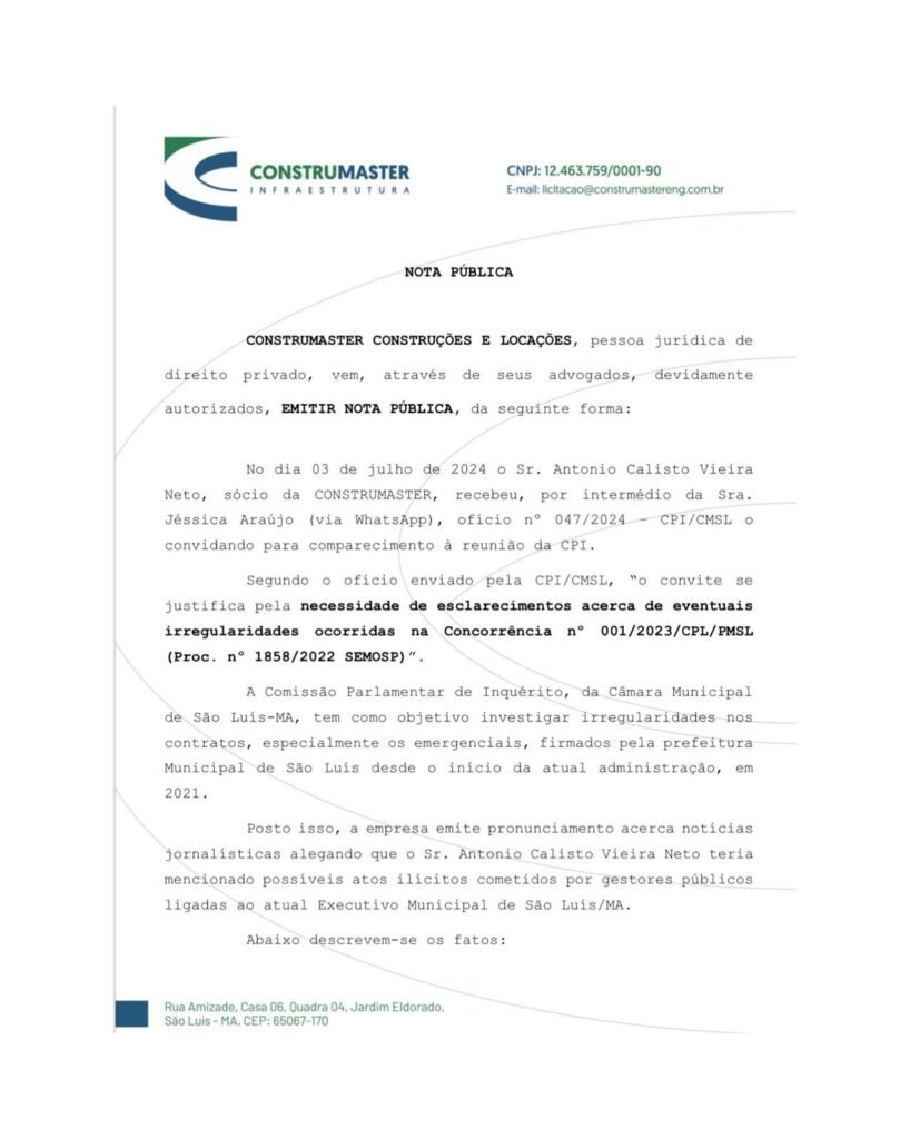 No centro de uma polêmica sobre uma licitação da prefeitura de São Luís, a Construmaster, do empresário Antônio Calisto, emitiu uma segunda nota explicando sua participação no processo licitatório nº 001/2023, iniciado em 13 de fevereiro de 2023. A empresa ofereceu o menor valor no Lote 1, com um deságio de R$ 28.999.611,76, mas a concorrência foi revogada.