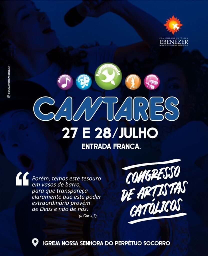 A Comunidade Católica Ebenézer realizará o Cantares, Congresso para Artistas Católicos. A programação conta com oficinas ministradas por grandes nomes da música, teatro e dança. A atração principal será o Ministério de Louvor e Adoração Ebenézer que se apresentará cantando músicas do CD autoral, acompanhado das apresentações do ministério de dança e teatro.