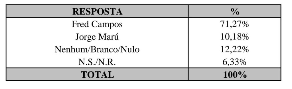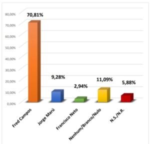 Já em uma disputa direta entre Fred Campos e Jorge Marú, o primeiro aparece com 71,27% contra 10,18% do seu adversário.