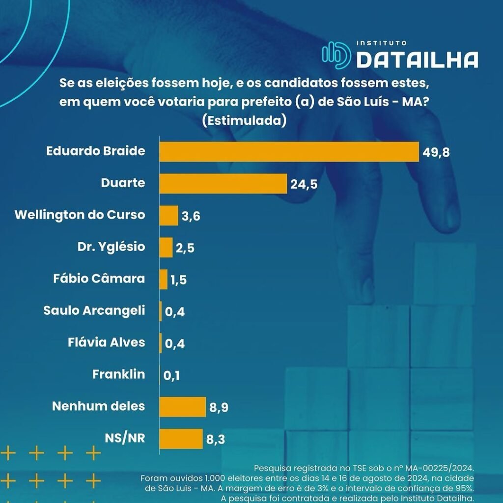 Nova pesquisa Datailha de intenções de votos para prefeito de São Luís aponta oscilação negativa do atual gestor, Eduardo Braide (PSD), em comparação com levantamento realizado em julho.