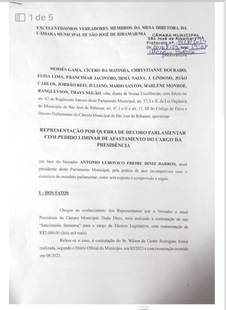 A Câmara de Vereadores de São José de Ribamar protocolou ontem, 20 de Agosto, o pedido de afastamento do presidente Dudu Diniz do cargo, por práticas consideradas incompatíveis com o exercício do mandato parlamentar, em resposta a denúncias feitas ao Ministério Público.