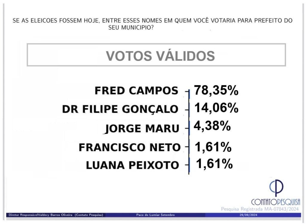 A pesquisa, que tem protocolo MA-07843/2024, ouviu 600 eleitores e foi realizada entre os dias 25 e 28 de setembro. A margem de erro é de 3,99 para mais ou menos e o intervalo de confiança é de 95%.