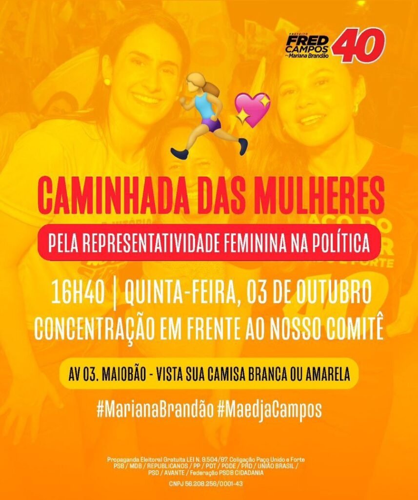 Mariana Brandão e Maedja Campos estão organizando um evento intitulado “Caminhada das Mulheres”, que tem como foco a representatividade política feminina. Esse tipo de ação busca promover a importância da participação das mulheres no cenário político, incentivando maior inclusão e visibilidade para as questões que afetam diretamente as mulheres.
