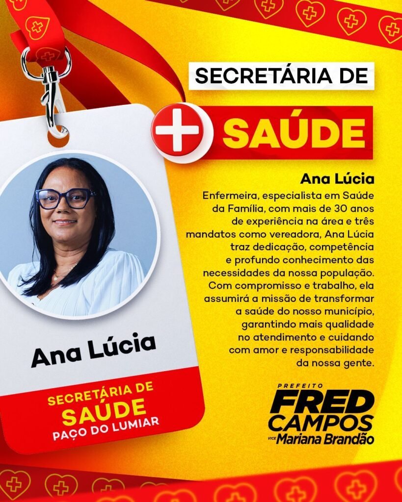 Ana Lúcia é enfermeira, especialista em Saúde da Família, e possui mais de 30 anos de experiência na área da saúde. Com três mandatos como vereadora, ela acumula um vasto conhecimento sobre as demandas da população e tem sido uma voz ativa na defesa de melhorias no setor. “Ana Lúcia traz dedicação, competência e profundo conhecimento das necessidades da nossa população”, afirmou Fred em sua publicação.