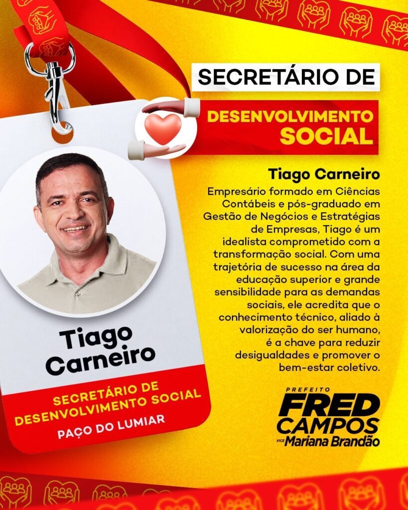 Na noite desta sexta-feira (22), o prefeito eleito de Paço do Lumiar, Fred Campos, anunciou por meio de suas redes sociais Tiago Carneiro como o novo Secretário Municipal de Desenvolvimento Social. O empresário, formado em Ciências Contábeis e pós-graduado em Gestão de Negócios e Estratégias de Empresas, traz consigo uma trajetória marcada por idealismo e compromisso com a transformação social.