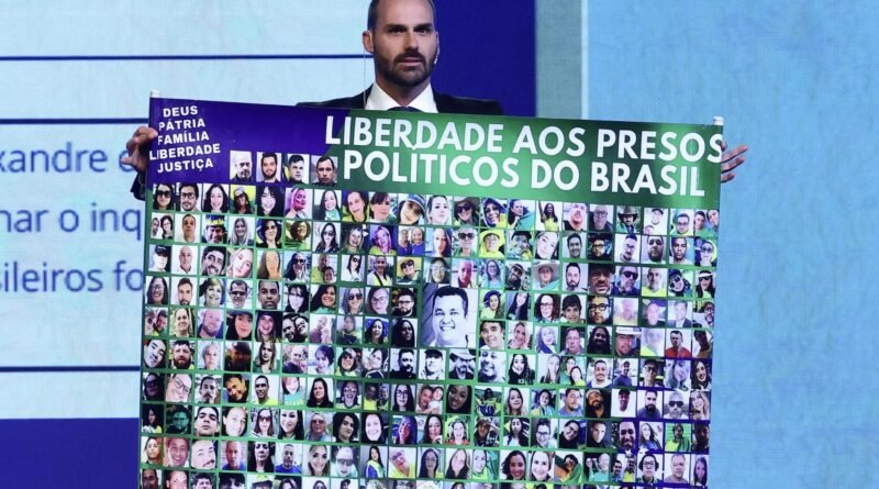Além disso, Eduardo defendeu os manifestantes presos pelos atos golpistas de 8 de janeiro em Brasília, classificando-os como cidadãos que “defendiam a verdade de modo pacífico”. A plateia reagiu com gritos de “liberdade” e “anistia”. Em outro ponto, Eduardo criticou o ministro do STF Alexandre de Moraes, a quem acusou de perseguir seu pai. O ex-presidente Jair Bolsonaro também participou da conferência, por vídeo, reiterando nunca ter cogitado um golpe e pedindo a devolução de seu passaporte para poder comparecer à posse de Donald Trump, caso eleito.
