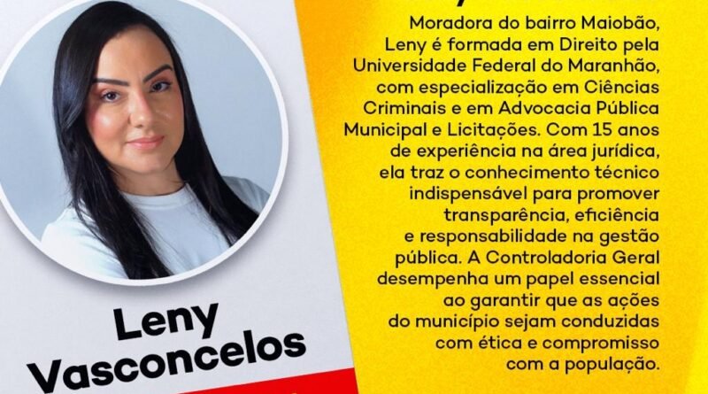 O prefeito eleito de Paço do Lumiar, Fred Campos, anunciou nesta quarta-feira (18) que a advogada Leny Vasconcelos será a nova Controladora Geral do município. Leny, que é moradora do bairro Maiobão, traz uma trajetória de 15 anos de experiência na área jurídica, consolidada por sua formação em Direito pela Universidade Federal do Maranhão (UFMA) e especializações em Ciências Criminais e em Advocacia Pública Municipal e Licitações.