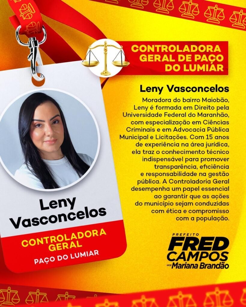 Fred destacou a escolha como um compromisso com a eficiência e a transparência na gestão pública. “Leny é uma profissional altamente capacitada, com o conhecimento técnico necessário para garantir que Paço do Lumiar tenha uma gestão responsável e eficiente. Sua experiência será fundamental para assegurar a transparência e o bom uso dos recursos públicos”, afirmou o prefeito.