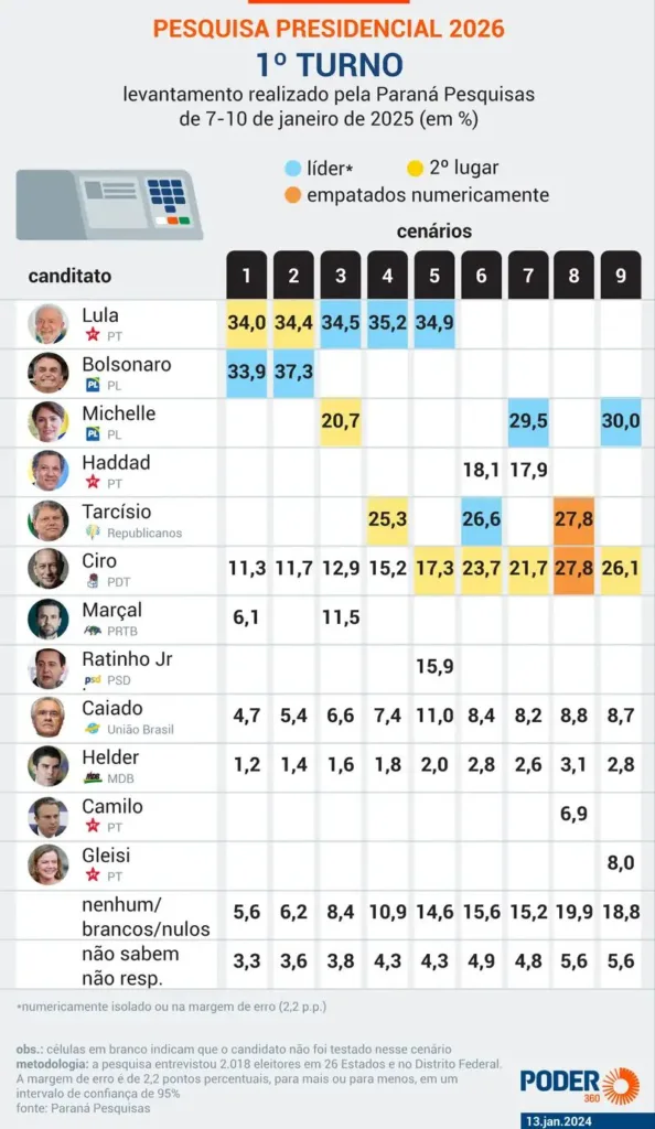 Levantamento divulgado pelo instituto Paraná Pesquisas nesta segunda-feira (13/1) aponta empate técnico entre o presidente Luiz Inácio Lula da Silva (PT) e o ex-presidente Jair Bolsonaro (PL) em uma eventual disputa presidencial em 2026. No cenário estimulado, Lula tem 34% das intenções de voto, e Bolsonaro 33,9%.