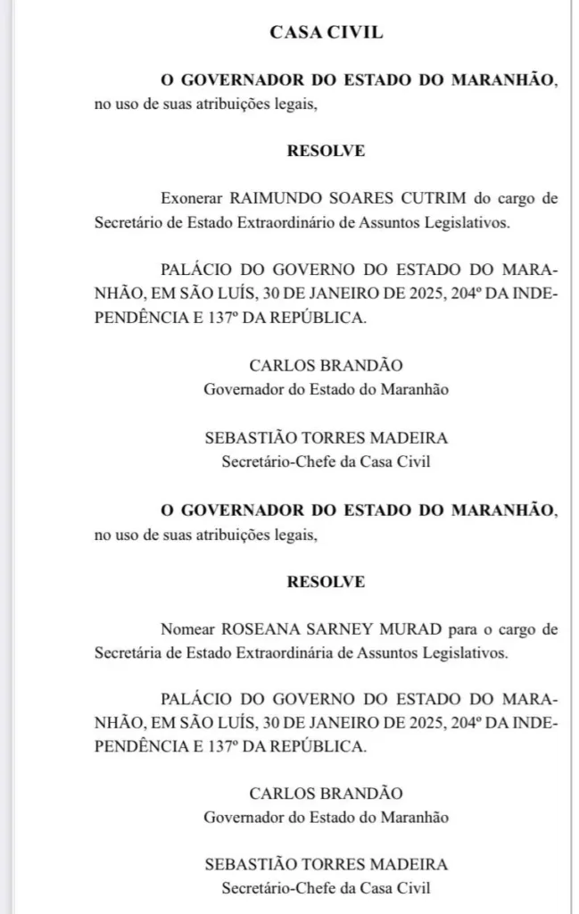 A ex-governadora e deputada federal Roseana Sarney(MDB) foi nomeada pelo governador Carlos Brandão (PSB) para a Secretaria de Estado Extraordinária de Assuntos Legislativos.