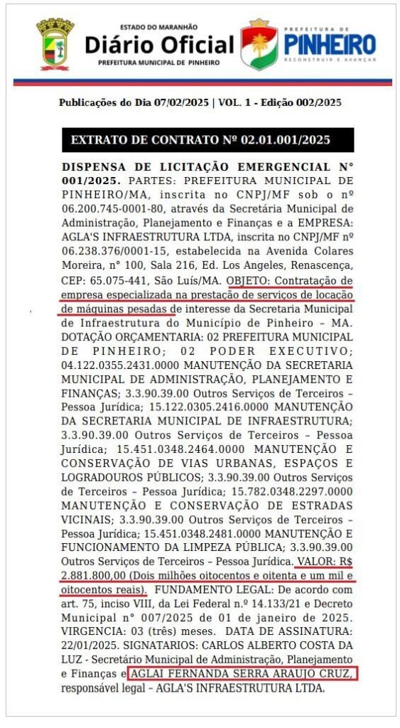 Conforme publicação do extrato nº 02.01.001/25 do Diário Oficial do município datado de dia 07 de fevereiro de 2025, o gestor selou contrato com a empresa “Agla’s Infraestrutura LTDA” ao valor de R$ 2.881.800,00 (dois milhões oitocentos e oitenta e um mil e oitocentos reais) com a finalidade de prestação de serviços de locação de máquinas pesadas de interesse da Secretaria Municipal de Infraestrutura. A vigência é de apenas três meses.