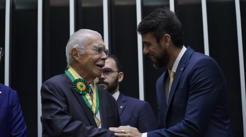 O deputado federal Pedro Lucas (UNIÃO/MA) foi autor da proposta que concedeu ao ex-presidente José Sarney a Medalha do Mérito Legislativo, a maior honraria concedida pela Câmara dos Deputados. A entrega ocorreu na sessão solene em celebração aos 40 anos da redemocratização do Brasil.