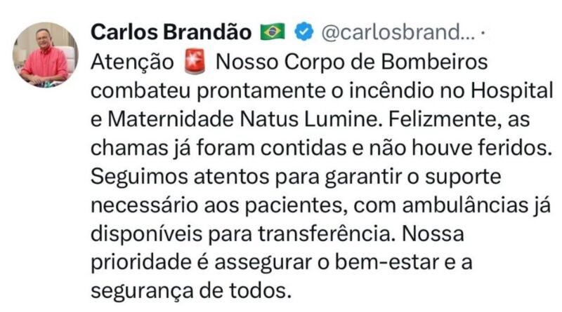 “Nosso Corpo de Bombeiros combateu prontamente o incêndio no Hospital e Maternidade Natus Lumine. Felizmente, as chamas já foram contidas e não houve feridos. Seguimos atentos para garantir o suporte necessário aos pacientes, com ambulâncias já disponíveis para transferência. Nossa prioridade é assegurar o bem-estar e a segurança de todos”, declarou Brandão.