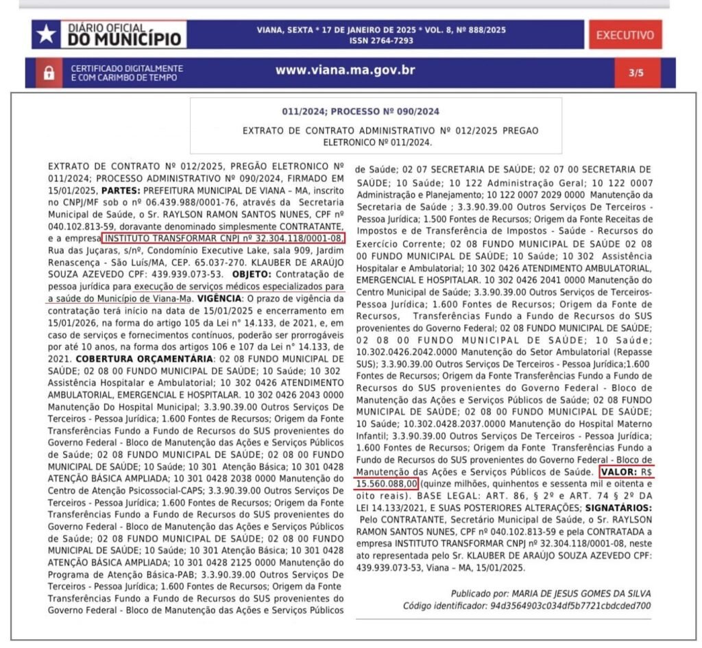 A contratação seria destinada à execução de serviços médicos no município. Contudo, a iniciativa gera forte suspeita, especialmente porque a saúde pública em Viana encontra-se em estado crítico, mesmo após o repasse de milhões de reais em recursos públicos nos últimos anos.