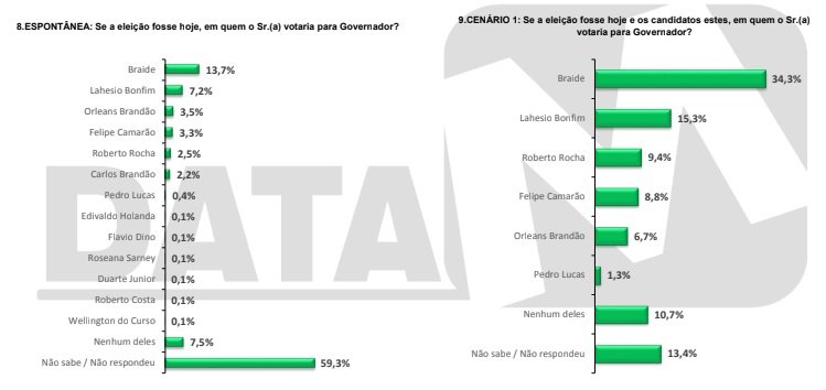 Na pesquisa Data M, o ex-senador Roberto Rocha (União) seria o terceiro com 9,4%, mas seguido de perto pelo vice-governador Felipe Camarão (PT) com 8,8% e do secretário de Assuntos Municipalistas do Governo, Orleans Brandão (MDB), com 6,7%. Seriam 10,7% que não estariam dispostos a votar em nenhum dos candidatos e 13,4% que não sabem ou não opinaram.