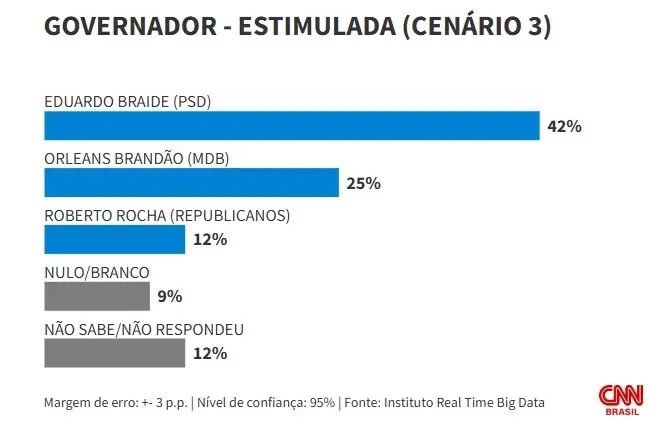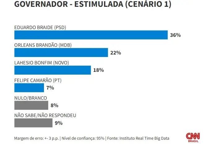 Em um dos cenários, Braide tem 36% as intenções de voto, contra 22% de Orleans Brandão (MDB), secretário de Assuntos Municipalistas do estado. Na sequência, aparece o ex-prefeito de São Pedro dos Crentes e ex-candidato ao governo do Maranhão em 2022 Lahesio Bonfim (Novo), com 18%.